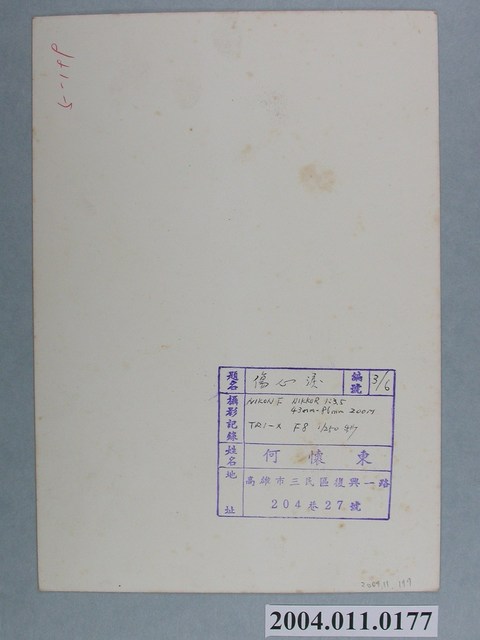 本物件為何懷東攝影作品傷心淚。物件本體為一張直式黑白照片,影像滿版無留白色邊框。圖像中被一名婦人抱在懷中的男童嚎啕大哭,淚水在他臉上已成一條淚痕。物件背面泛黃,印有題名、編號、攝影記錄、姓名、地址等資料欄位,清楚寫有攝影者為何懷東,及其拍攝此張照片時使用的攝影模式等資訊。在物件左上方寫有「5-119」的數字編號。