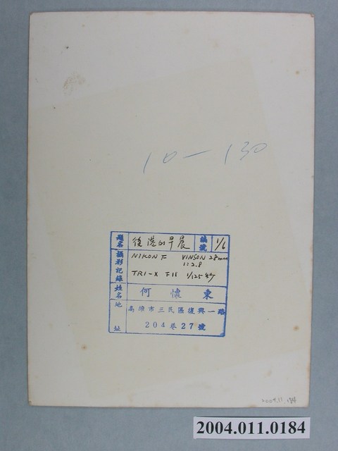 本物件為何懷東攝影作品後港的早晨。物件本體為一張直式黑白照片,影像滿版無留白色邊框。圖像為高處向下拍攝,可見一棟樓房前一家人聚在門前活動,或做家事或與孩童嬉戲。物件背面有些許污漬,印有題名、編號、攝影記錄、姓名、地址等資料欄位,清楚寫有攝影者為何懷東,及其拍攝此張照片時使用的攝影模式等資訊。在欄位上方寫有「10-130」的數字編號。