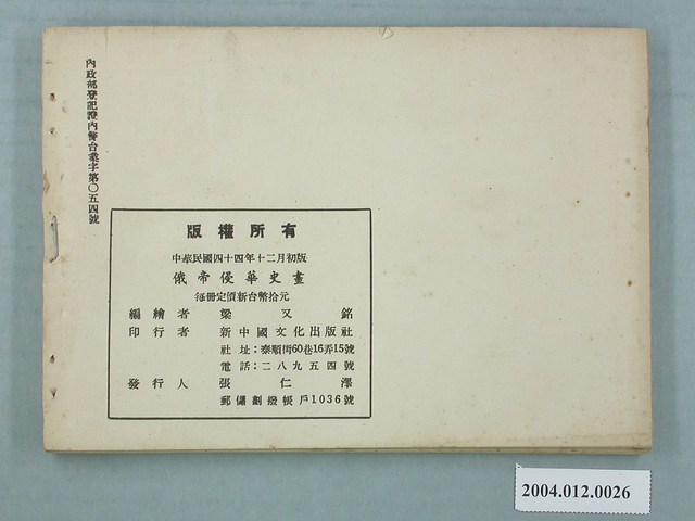 1.本件《俄帝侵華史畫》為梁又銘所編繪,民國44年12月由新中國文化出版社所出版,發行人為張仁澤。該書封面以紅色俄羅斯宮殿盤據於地球一隅的圖像,象徵俄國的帝國主義勢力。2.《俄帝侵華史畫》以圖像方式,呈現清代以來俄國帝國主義如何侵略中國,也勾勒了清代以來的中俄關係。
