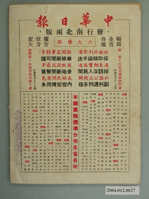 2.《中華日報》是中國國民黨於1946年在臺灣臺南市所創辦的地方報。公司全名為「臺灣中華日報社股份有限公司」。創刊初期,《中華日報》總社設於臺南車站前方,原建物為日本勸業銀行臺南分行(1981年拆除)。1948年2月20日在臺北市設立總社並增出北部版,一度採南北兩版平行發行形式。早期為考量民眾閱讀:有中、日文並刊設計,作家龍瑛宗即曾任日文版文藝欄主編;後因響應政府推廣國語文政策,遂於1946年10月25日起改為純中文版。