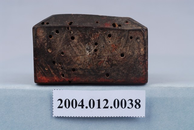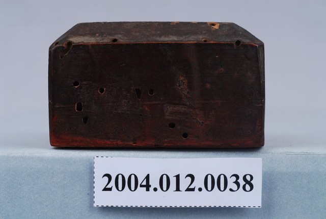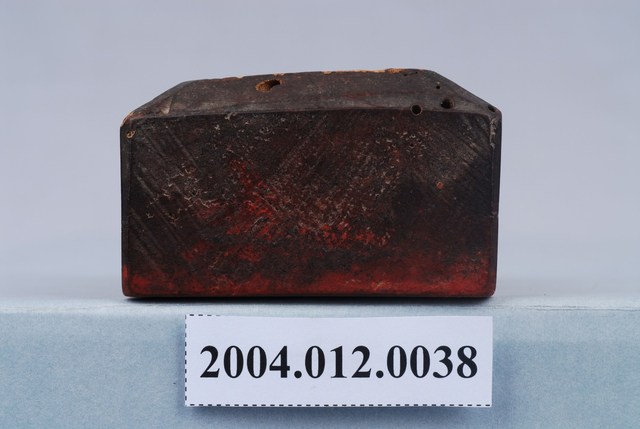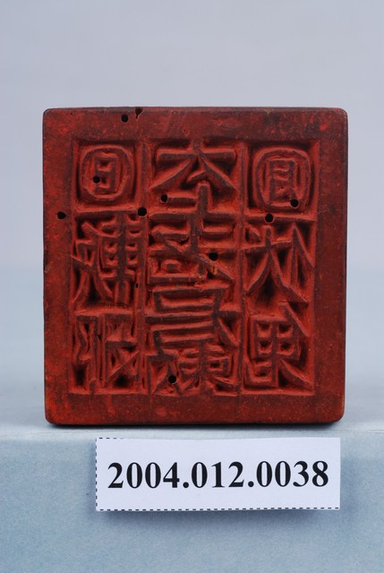 本件太上老君法印為方形印章,無印鈕。法印印文為三行陽刻楷體朱文,三行文字之間以直線區隔。中央一行「太上老君勅」,右行「日、斬邪」,左行「月、伏鬼」,印身上方鐫刻「上」字。印身施有黑色漆,但有脫落與多處蛀蝕穿洞情形。