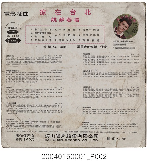 2004.015.0001 海山唱片公司發行編號「SL-2128」華語歌曲專輯《家在台北》