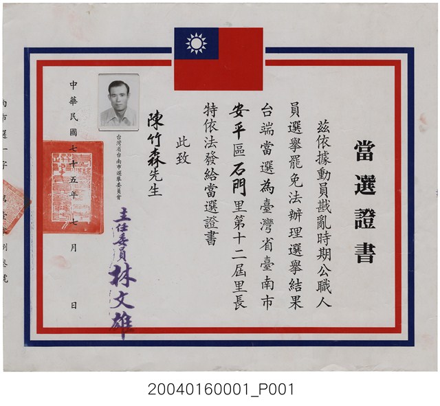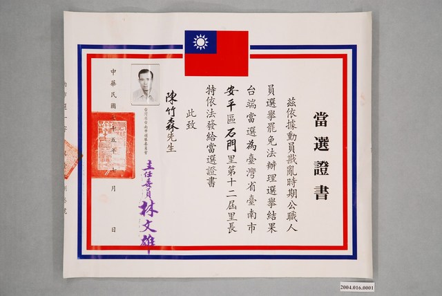 2004.016.0001 臺南市安平區石門里第12任里長陳竹森當選證書