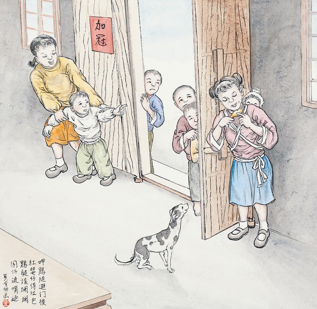 2004.019.0009 黃金田繪《呷雞腿避門後》