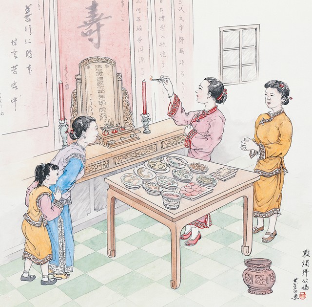 2004.019.0049 黃金田繪《點燭拜公媽》