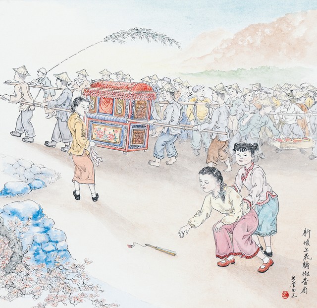 2004.019.0052 黃金田繪《新娘上花轎拋香扇》