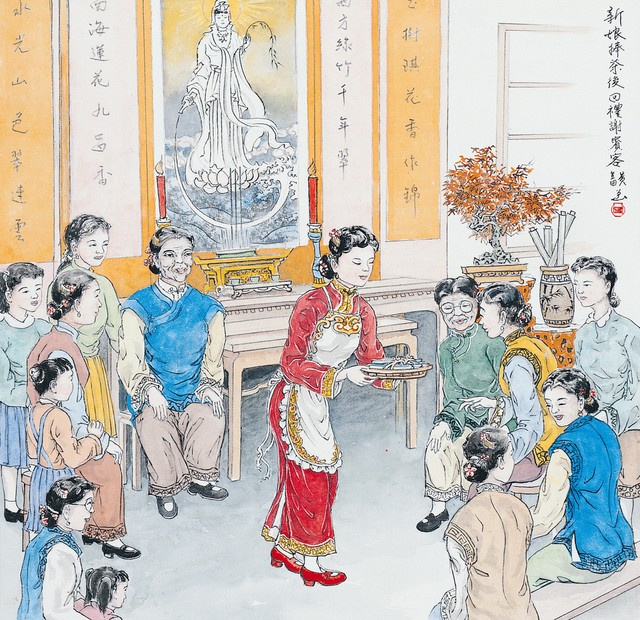 黃金田繪《新娘捧茶後回禮謝賓客》