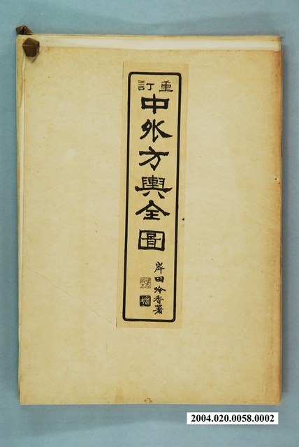 〈重訂中外方輿全圖〉,編輯兼發行者岸田吟香,發行所樂善堂。1894年8月初版,本件是1905年2月25日訂正增補第16版。