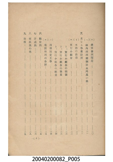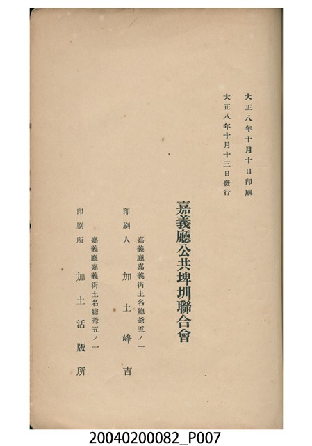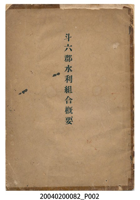 1.本物件為嘉義廳公共埤圳聯合會發行的《斗六郡水利組合概要》,印刷人為加土峰吉,印刷所為加土活版所,大正8年(1919)10月10日印刷,大正8年(1919)10月13日發行。內容有地勢、區域、起源及沿革、灌溉狀況、主要工作物、事業計畫、人員名單、財務資訊等。物件封面只有中間直行黑色標題寫著「斗六郡水利組合概要」,旁邊則稍有黑色汙漬,紙張泛黃嚴重,右邊裝訂頁則稍有破損,還有水漬在封面上,內容推測應以日文為主,版權頁的部分亦以黑色直行文字書寫相關資訊。紙張皆泛黃且邊框稍有磨損。