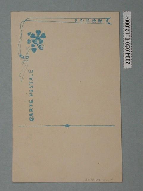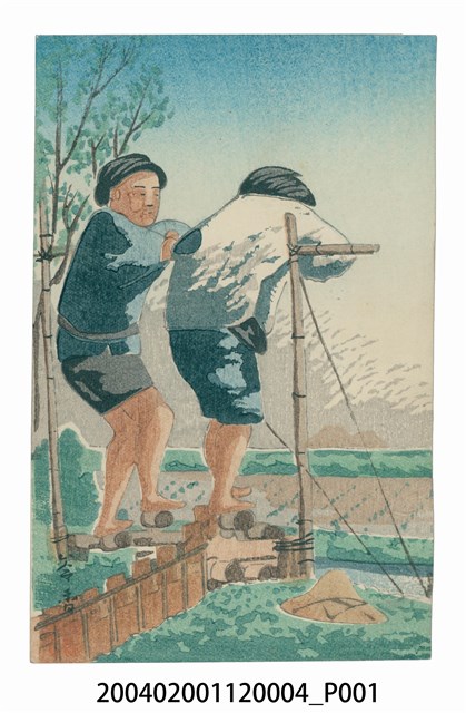 1.本物件為以臺灣生活為主題之明信片,其正面為兩名男子踩龍骨車彩色版印,畫面中可見兩名男子皆身著長袖短褲,上身趴於搭建的竹架上,雙腳踩踏龍骨車踏板,而右下角則有一斗笠置於草地上,明信片左下方有簽名及紅印,字樣難以辨識;背面為空白明信片橫式書寫面,以藍色單色印刷,從右上方至右側有一緞帶圖樣,並有花朵、蜜蜂圖樣,右下方緞帶內有「郵便はがき」,正上方有「CARTE POSTALE」字樣。2.龍骨車為一灌溉農具,其為東漢末年畢嵐所發明,其前方為輪軸踏板,踩動踏板會帶動後方一長串的矩形木板,其能將低處的水推動,引向高處的農田灌溉,於臺灣早期農村十分常見。