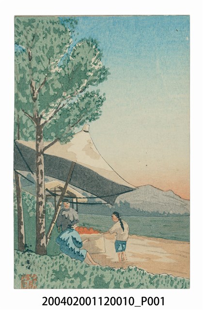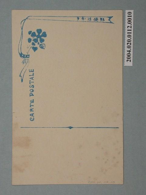本物件為以臺灣生活為主題之明信片,其正面為街邊攤販彩色版印,畫面中可見在農村道路旁,有一著深藍色衣服之攤商坐於路旁,上方有白色大型陽傘,男子前方有檯子,上有橘紅色物品貌似水果,攤子前有一名男子頂著清代長辮髮型,遠景可見山岳,明信片左下方有簽名及紅印,字樣難以辨識;背面為空白明信片橫式書寫面,以藍色單色印刷,從右上方至右側有一緞帶圖樣,並有花朵、蜜蜂圖樣,右下方緞帶內有「郵便はがき」,正上則方有「CARTE POSTALE」字樣。