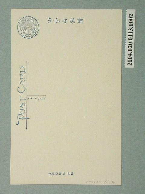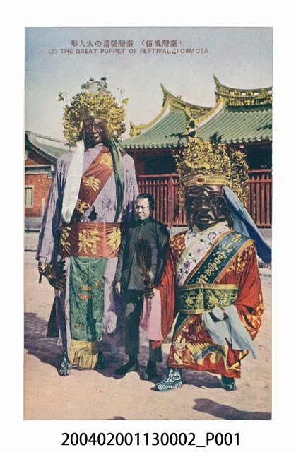 1.本物件為以宗教慶典為主題之明信片,正面為臺灣祭禮之神將彩色圖像,畫面中可見范謝將軍之神將,各批有「青山宮靈安」、「義英社」字樣之紅布條,正與中一名身著黑衣、黑褲、黑鞋之男子合影,後方景象為廟宇,可見黃金色的屋脊及綠色屋頂樣式,明信片上方有「(臺灣風俗)臺灣祭禮の大人形」、「(3)THE GREAT PUPPET OF FESTIVAL, FORMOSA」;背面為空白明信片直式書寫面,以藍色單色印刷,左上為郵票黏貼處,為有著經緯線、地圖的地球圖樣,上方有「郵便はかき」字樣,正下方有「臺北新高堂發行」,左側有「POST CARD」以及「Made in Japan」字樣。