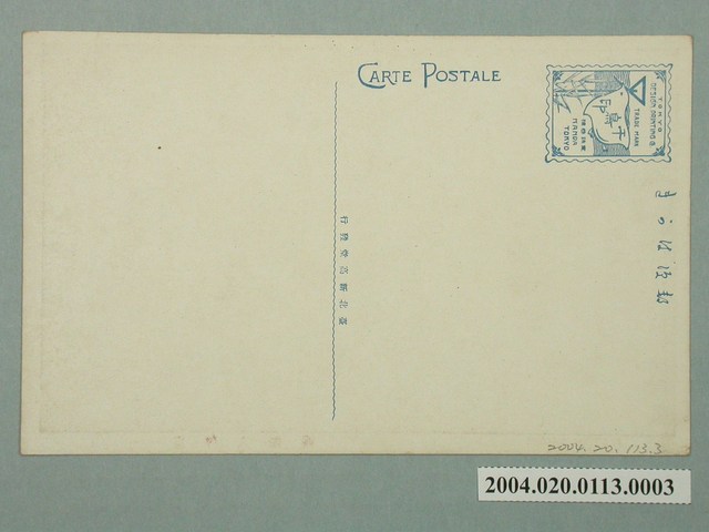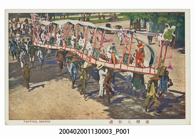 本物件為以宗教慶典為主題之明信片,正面為臺灣人祭禮彩色圖像,畫面中可見一組藝閣陣頭橫過畫面,其下方由人抬著,上方猶如一艘船,底為紅白樣式,內有人像各呈不同姿勢,上有白色遮罩,畫面中有眾多人群跟在其後方,明信片下方有「臺灣人祭禮」、「FASTIVAL, SAVAGS」;背面為空白明信片直式書寫面,以藍色單色印刷,左上為郵票黏貼處,內有斗大的「千鳥印」字樣,以及「TOKYO DESIGN PRINTING TRADE MARK」、「KANDA TOKYO」字樣,上方有「郵便はかき」字樣,左側有「CARTE POSTALE」以及「臺北新高堂發行」字樣。
