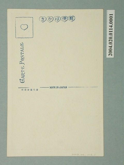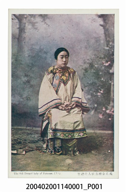 1.本物件為以臺灣婦女為主題之明信片,其正面為舊式臺灣貴婦裝扮彩色照片,畫面中可見一女子呈坐姿面向鏡頭,髮型呈中分向後梳起,服飾整體為淺黃色,於領邊有金屬色澤之花紋樣式,袖口寬大且有綠、紅色線條,群尾亦有綠、紅色線條及花邊裝飾,造型典雅,明信片下方有「舊式臺灣貴婦人の禮裝」、「The full Dressed lady of Formosa.(15)」;背面為空白明信片直式書寫面,以藍色單色印刷,左上為郵票黏貼處,內有一心型圖樣,上方有「郵便はかき」字樣每個字皆以心型圖樣個別框起,左側有「CARTE POSTALE」以及「臺北藤倉發行」字樣,正中間有「MADE IN JAPAN」。2.臺灣漢人傳統服飾源於中國原鄉,精於細部裝飾,其上衣統稱為衫,成套衫裙多於重大場合才穿,而連身裙裝因側邊有開岔,需多穿長褲。