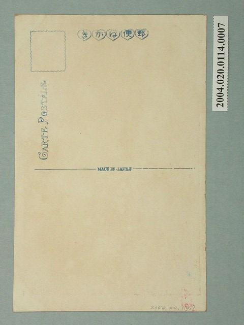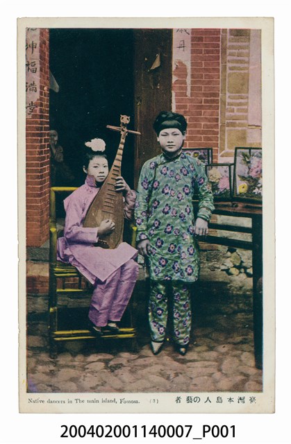 1.本物件為以臺灣婦女為主題之明信片,其正面為臺灣藝者彩色照片,畫面中可見兩名少女面對鏡頭,右側站姿女子身著綠色帶有粉色花朵之服裝,左側女子呈坐姿,身著粉色服裝,胸前抱有一琵琶,兩名女子皆裹小腳,看似年少,背景右側有一桌子上擺有花朵,後方為一房屋門口,紅磚門框上有殘破的春聯,明信片下方有「臺灣本島人の藝者」、「Native dancers in The main islandGirls of Formosa.(3)」;背面為空白明信片直式書寫面,以藍色單色印刷,左上為郵票黏貼處,內有一心型圖樣,上方有「郵便はかき」字樣每個字皆以心型圖樣個別框起,左側有「CARTE POSTALE」,正中間有「MADE IN JAPAN」。2.臺灣漢人傳統服飾源於中國原鄉,精於細部裝飾,其上衣統稱為衫,成套衫裙多於重大場合才穿,而連身裙裝因側邊有開岔,需多穿長褲。裹小腳於臺灣早期社會十分常見,女童約於4、5歲時便需接受纏足,過程痛苦,纏足後不便於勞動,遂衍伸成名媛指標之一,日治時期日本政府則認為纏足為臺人陋習之一,力求解纏足。