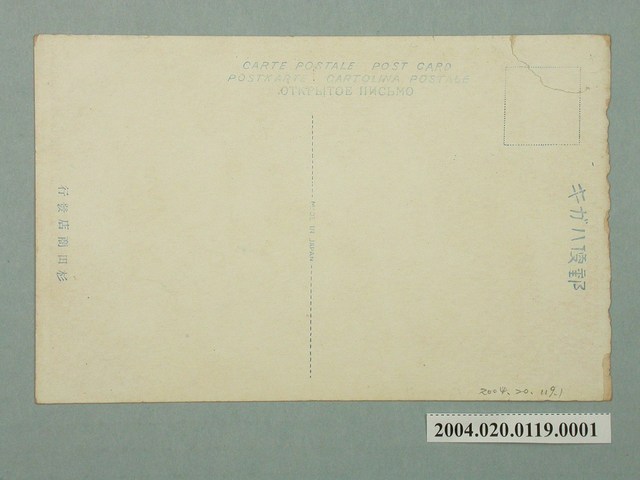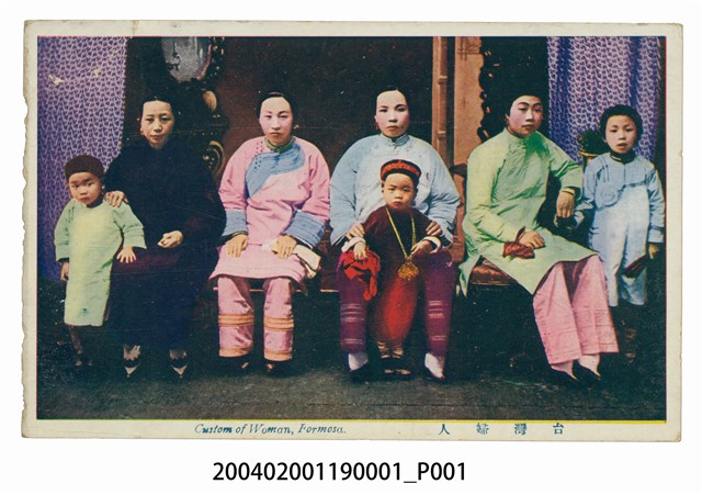 1.本物件為以臺灣婦女為主題之明信片,其正面為臺灣婦人彩色照片,畫面中可見四名婦人與三名孩童面向鏡頭,婦女各個呈坐姿,著長袍內搭長褲,服飾色系由左至右為深褐色、粉藍配色、水藍色、青綠色,每名婦女皆裹小腳,孩童則頭戴帽深色,著長袍,服飾色系由左至右為青綠色、深褐色、水藍色,正中間的孩童則掛有一貴重項鍊,背景可見左側一面圓鏡,右側有布簾,明信片下方「台灣婦人」、「Custom of Woman, Formosa.」;其背面為空白明信片橫式書寫面,以藍色單色印刷,右上方為郵票黏貼處,右側有「郵便ハがキ」字樣,左側有「杉田商店發行」,正上方有「CARTE POSTALE POST CARD」及兩行字樣,由上至下為「POSTKARTE CARTOLINA POSTALE 」、「OTKPbITOE IIИCbMO」,中央處有「MADE IN JAPAN」字樣。2.臺灣漢人傳統服飾源於中國原鄉,精於細部裝飾,其上衣統稱為衫,成套衫裙多於重大場合才穿,而連身裙裝因側邊有開岔,需多穿長褲。裹小腳於臺灣早期社會十分常見,女童約於4、5歲時便需接受纏足,過程痛苦,纏足後不便於勞動,遂衍伸成名媛指標之一,日治時期日本政府則認為纏足為臺人陋習之一,力求解纏足。