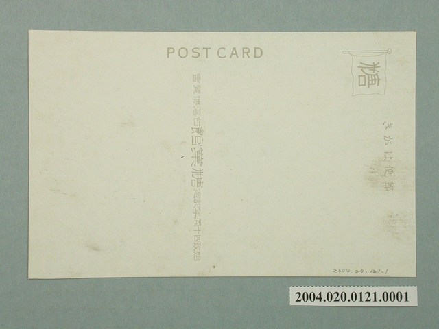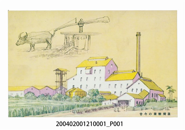 1.本物件為以臺灣糖業為主題之明信片,正面為臺灣糖業之今昔彩色繪圖,畫面中可見一淺色建物,屋頂為黃色,右側有高聳煙囪,此為糖廠,明信片左上方有一素描圖樣,內容是以獸力─牛,運轉機器榨甘蔗,此為製糖古法,明信片右下方有「我が臺灣の使命」字樣;背面為空白明信片直式書寫面,以褐色單色印刷,左上為郵票黏貼處,有一旗幟圖樣內有「糖」字,上方有「郵便はかき」字樣,左側有「POST CARD」字樣,正中間則為「始政四十周年記念糖業館臺灣博覽會」。2.臺灣荷治時期即開始製糖並運銷國外,日治時期品種的改良加上新式製糖的出現,使臺灣製糖產業獲得大規模發展。始政四十年紀念臺灣博覽會為西元1935年10月至11月以臺北為主舉辦的博覽會,目的為宣傳其統治的政績,及臺灣各項政策的成果,主要分為4個會場,糖業館位於第一會場,由於糖業之生產具半農業半工業的特性,因此獨立為館由殖產局特產課、糖業試驗所及糖業聯合會共同負責。