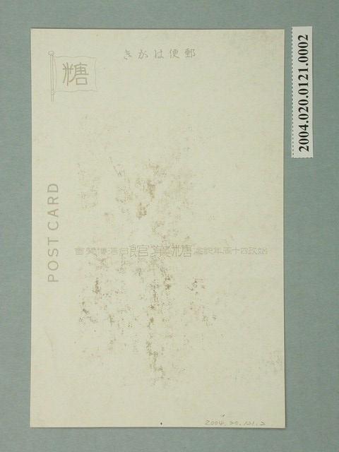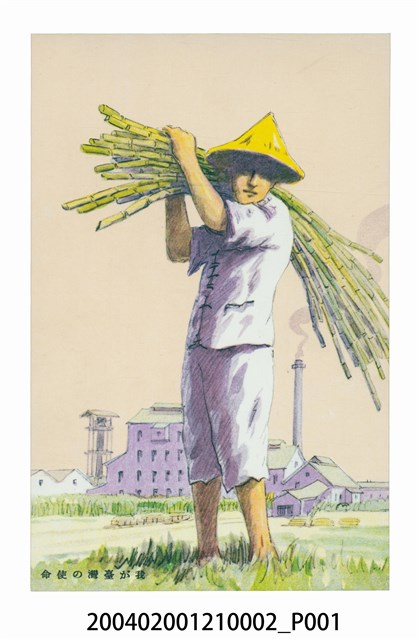 1.本物件為以臺灣糖業為主題之明信片,正面為我的臺灣使命彩色繪圖,畫面中可見一名男子頭戴斗笠,身著白色短袖、短褲,肩上扛有一批甘蔗,遠景則為一淺色建物,右側有高聳煙囪,推測應為糖廠,明信片下方有「我が臺灣の使命」字樣;背面為空白明信片直式書寫面,以褐色單色印刷,左上為郵票黏貼處,上方有「郵便はかき」字樣,下方有「臺灣總督府殖產局」、「東陽堂印刷」,左側有「CARTE POSTALE」字樣。2.臺灣荷治時期即開始製糖並運銷國外,日治時期品種的改良加上新式製糖的出現,使臺灣製糖產業獲得大規模發展,而戰後因受戰爭影響,許多製糖工場於戰時損壞,雖有重新修復,但臺灣糖業經濟已逐漸沒入下坡。