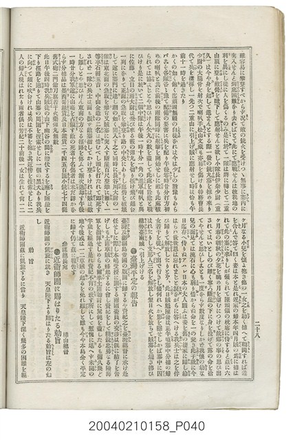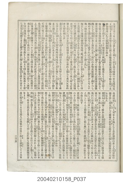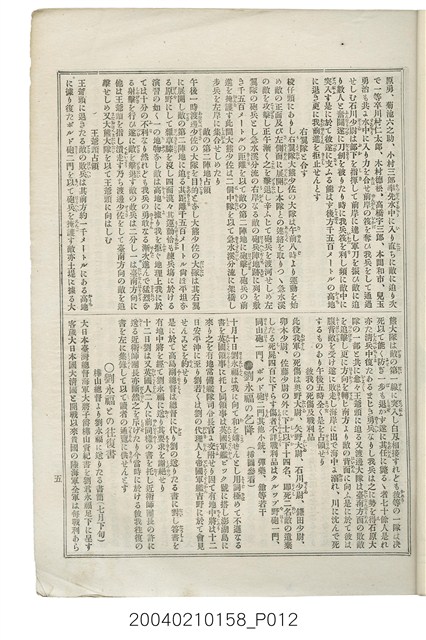 第5編於明治29年(1896)2月25日發行,封面圖描寫臺灣戡定後情景。內容從臺灣戡定祝詞論說起,報導10月10日至11月20日間海軍登陸枋寮、劉永福乞降、佔領臺南府、近衛師團的凱旋等戰事情形。全書文字34頁,插圖13頁(含封面圖),每本定價金拾錢。漫錄附有熟蕃與生蕃風俗之介紹、及安平港、臺南府、臺北城等市街景象圖。