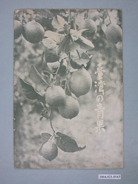 本物件為臺灣の青果書籍,紙質文物。該物件以鳳梨黑白照片為封面頁,封面上方可見「臺灣の青果」字樣。物件背面可見檸檬黑白照片,右方可見「臺灣の青果」字樣。物件內頁主要為臺灣水果的圖像及文字說明(包括香蕉、鳳梨、荔枝、柚子…等),亦可見該書為「昭和十四年五月十日再版發行」、編纂兼發行為「臺灣總督府殖產局特產課」、印刷人為「勝山祐芳(清野印刷所臺灣代理店 臺北市樺山町昭和ビル)」、印刷所為「株式會社清野印刷所(名古屋市中區西川端町二丁目)」。