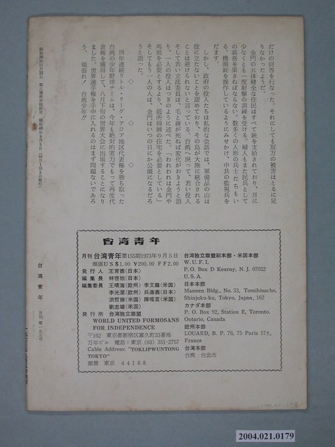 此為一紙質雜誌,此書為臺灣獨立聯盟於1973年9月5日出版的《臺灣青年》月刊第155號。 此件的出版者為臺灣青年獨立聯盟,在1965年5月臺獨的重要領袖廖文毅被迫從日本回到臺灣之後,臺灣青年獨立聯盟於該年9月成立,接續扛起日本臺獨勢力的大旗。臺青聯前身為1960年創辦的「臺灣青年社」,由東京大學講師王育德創立,並以日文發行《臺灣青年》雜誌宣揚臺獨理念。其後由於內部幹部認為只發行刊物並不足夠,因此於1963年組織化且改組為「臺灣青年會」,後於1965年再改組成臺灣青年獨立聯盟。改組後除發行刊物宣揚理念外,也曾在1966年美國國務卿出訪京都時,對美國支持中華民國政府的立場進行絕食抗議,但在1968年重要幹部柳文卿被遣返回臺的事件後,內部分裂且相關行動漸趨低調,最終使臺獨運動由日本轉至美國發展。臺灣青年獨立聯盟最終於1970年與臺獨聯盟合併,成為臺獨聯盟日本本部。(葉亭葶。2016。269) 在臺灣社會,關於「臺灣獨立」最早的具體事件為1947年發生的「815臺獨案」。在日本戰敗的背景下,一批臺灣仕紳與日本軍官共同研擬了「臺灣自治」方案,但遭總督安藤利吉反對,而後不了了之(陳儀深,2010。140-141)。二二八事件後,廖文毅、史明、王育德、黃昭堂等人在國外展開臺獨運動,並在多國建立臺獨組織。1960至1970年代,臺灣社會發生若干臺獨事件,其中彭明敏師生於1964年所發起的〈臺灣自救運動宣言〉最具代表性(陳儀深,2010。149-152)。解嚴前後,在蔡有全、許曹德、鄭南榕等人士的推動下,「臺獨」在臺灣社會逐漸受人接受。