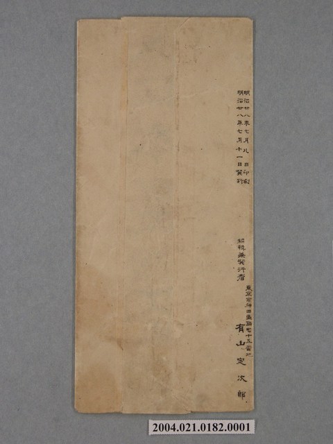 〈大日本臺灣全圖〉,編輯兼發行者有山定次郎,1895年7月9日印刷、7月11日發行。 本件為封套,上有「大日本臺灣全圖」、「附澎湖島並琉球諸島」字樣。