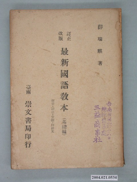 2004.021.0534 薛瑞麒著《最新國語教本基礎編》