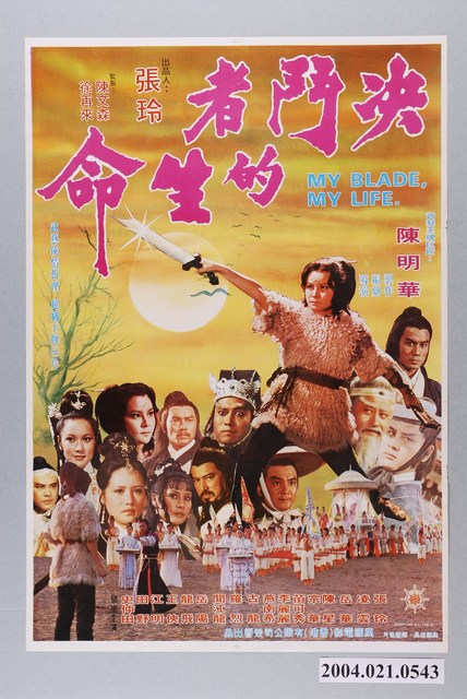 1.臺灣電影《決鬥者的生命》上映時的中文彩色海報,直式印刷。畫面主要呈現女主角陳明華高舉著劍,踩著弓箭步,將劍指向天邊的全身特寫,以及劇中角色們的劇照頭像拼貼。搭配「武藝俠情哲理 超級王牌巨片」、「武俠王牌巨星:陳明華 製作編劇導演」、「MY BLADE, MY LIFE.」2.本片是1978年由萬國電影(香港)有限公司出品,陳明華編導,張玲、淩雲、岳華主演的武俠劇情片。