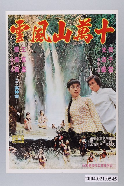 1.臺灣電影《十萬山風雲》上映時的中文彩色海報,直式印刷。畫面主要呈現衛子雲和史淑藝兩人的半身特寫,背景為瀑布下有穿著清涼的女子在旁休憩,前景為一群穿著清涼的女子被騎馬的兩名男子追趕著,在淺水上奔跑、激起水花的場景。海報有二折折痕。2.本片是1980年由山河電影事業有限公司出品,宏恩電影有限公司發行,高仲宵執導,梁永珍編劇,衛子雲、史淑藝、王昆峯主演的文藝劇情片。