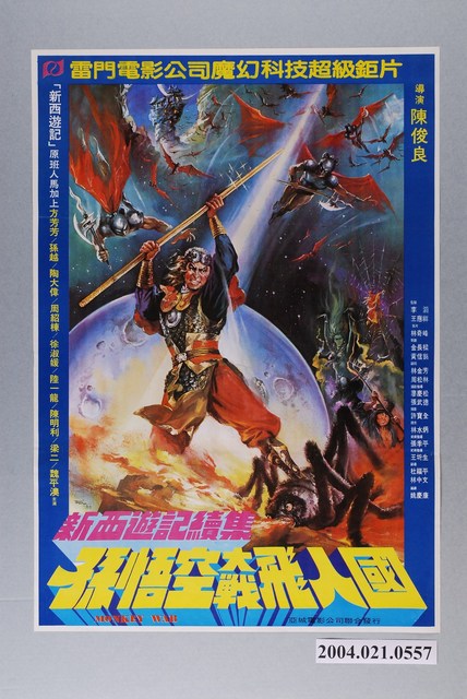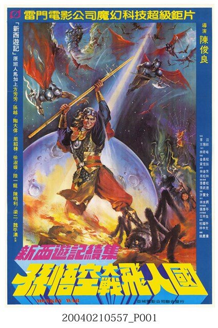1.手繪海報大師陳子福之作,臺灣電影《新西遊記續集 孫悟空大戰飛人國》上映時的中文彩色海報,直式印刷。畫面主要呈現孫悟空持金箍棒,大戰噴火蜘蛛、天兵天將等各路人馬,背景為月球全景。搭配「雷門電影公司魔幻科技超級鉅片」、「『新西遊記』原班人馬加上」等文案字樣。海報上有陳子福簽名。2.本片是1982年由雷門電影公司出品,雷門電影企業有限公司、亞城電影公司聯合發行,陳俊良執導,姚慶康編劇,劉尚謙、陶大偉、周紹棟主演的神怪劇情片。