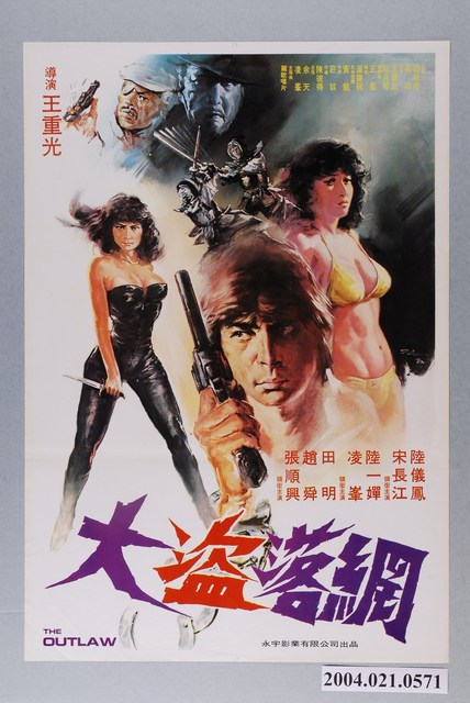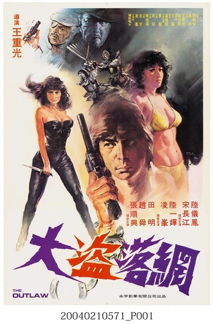 1.手繪海報大師陳子福之作,臺灣電影《大盜落網》上映時的中文彩色海報,直式印刷。畫面主要呈現男主角持槍的手腕銬著鬆脫的手銬,神情嚴肅的模樣,以及兩名女主角的造型:一身黑色緊身皮衣且手拿著短刀,擺出警戒的姿勢;穿著黃色三點式泳裝,一臉哀戚的模樣。海報上有陳子福簽名。海報有二折折痕。2.本片是1982年由永宇影業公司出品,泰乙影業有限公司發行,王重光執導,溫捷硯編劇,陸儀鳳、宋長江、陸一嬋主演的社會劇情片。
