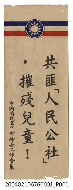 此為一紙質宣傳品,宣傳品上方有兩橫條並印有中國國民黨黨徽,為中國國民黨中央婦女工作會製,內容為〈共匪「人民公社」,摧殘兒童!〉。 此件所提及的「婦工會」,為中國國民黨於1953年所創辦的婦女工作會,隸屬於國民黨中央委員會下的中央婦女工作指導會議。宋美齡在 1950年代開始整合臺灣婦女界的民間力量,先於1950年創設民間團體「中華民國婦女聯合會」,而後在中國國民黨內設立「中國國民黨中央婦女工作會」,以領導、動員婦女,並成為聚集臺灣婦女的最高機構。此外,婦工會也配合國民黨政策,協助進行反共抗俄的宣傳。 此為戒嚴時期「婦工會」配合中華民國政府反共政策所印製的宣傳品,1949年中華民國政府撤退來臺之後,與中共政權依然透過政治宣傳隔海交戰。中華民國政府對內藉由教育、口號及政治文宣來宣傳「反攻大陸」,穩固在臺澎金馬地區的統治;對外則以中共政權內部的動盪狀況,塑造臺灣社會「中華文化復興基地」的形象,爭取中國大陸民眾、各地海外華僑及國際社會的認同。