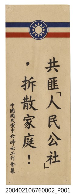 此為一紙質宣傳品,宣傳品上方有兩橫條並印有中國國民黨黨徽,為中國國民黨中央婦女工作會製,內容為〈共匪「人民公社」,拆散家庭!〉。 此件所提及的「婦工會」,為中國國民黨於1953年所創辦的婦女工作會,隸屬於國民黨中央委員會下的中央婦女工作指導會議。宋美齡在 1950年代開始整合臺灣婦女界的民間力量,先於1950年創設民間團體「中華民國婦女聯合會」,而後在中國國民黨內設立「中國國民黨中央婦女工作會」,以領導、動員婦女,並成為聚集臺灣婦女的最高機構。此外,婦工會也配合國民黨政策,協助進行反共抗俄的宣傳。 此為戒嚴時期「婦工會」配合中華民國政府反共政策所印製的宣傳品,1949年中華民國政府撤退來臺之後,與中共政權依然透過政治宣傳隔海交戰。中華民國政府對內藉由教育、口號及政治文宣來宣傳「反攻大陸」,穩固在臺澎金馬地區的統治;對外則以中共政權內部的動盪狀況,塑造臺灣社會「中華文化復興基地」的形象,爭取中國大陸民眾、各地海外華僑及國際社會的認同。