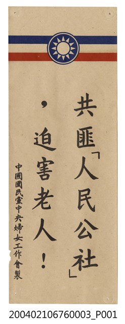 此為一紙質宣傳品,宣傳品上方有兩橫條並印有中國國民黨黨徽,為中國國民黨中央婦女工作會製,內容為〈共匪「人民公社」,迫害老人!〉。 此件所提及的「婦工會」,為中國國民黨於1953年所創辦的婦女工作會,隸屬於國民黨中央委員會下的中央婦女工作指導會議。宋美齡在 1950年代開始整合臺灣婦女界的民間力量,先於1950年創設民間團體「中華民國婦女聯合會」,而後在中國國民黨內設立「中國國民黨中央婦女工作會」,以領導、動員婦女,並成為聚集臺灣婦女的最高機構。此外,婦工會也配合國民黨政策,協助進行反共抗俄的宣傳。 此為戒嚴時期「婦工會」配合中華民國政府反共政策所印製的宣傳品,1949年中華民國政府撤退來臺之後,與中共政權依然透過政治宣傳隔海交戰。中華民國政府對內藉由教育、口號及政治文宣來宣傳「反攻大陸」,穩固在臺澎金馬地區的統治;對外則以中共政權內部的動盪狀況,塑造臺灣社會「中華文化復興基地」的形象,爭取中國大陸民眾、各地海外華僑及國際社會的認同。