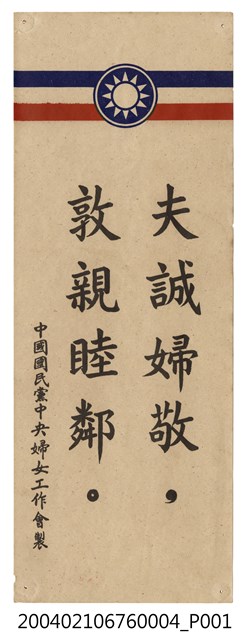 此為一紙質宣傳品,宣傳品上方有兩橫條並印有中國國民黨黨徽,為中國國民黨中央婦女工作會製,內容為〈夫誠婦敬,敦親睦鄰。〉。 此件所提及的「婦工會」,為中國國民黨於1953年所創辦的婦女工作會,隸屬於國民黨中央委員會下的中央婦女工作指導會議。宋美齡在 1950年代開始整合臺灣婦女界的民間力量,先於1950年創設民間團體「中華民國婦女聯合會」,而後在中國國民黨內設立「中國國民黨中央婦女工作會」,以領導、動員婦女,並成為聚集臺灣婦女的最高機構。此外,婦工會也配合國民黨政策,協助進行反共抗俄的宣傳。 此為戒嚴時期「婦工會」配合中華民國政府反共政策所印製的宣傳品,1949年中華民國政府撤退來臺之後,與中共政權依然透過政治宣傳隔海交戰。中華民國政府對內藉由教育、口號及政治文宣來宣傳「反攻大陸」,穩固在臺澎金馬地區的統治;對外則以中共政權內部的動盪狀況,塑造臺灣社會「中華文化復興基地」的形象,爭取中國大陸民眾、各地海外華僑及國際社會的認同。