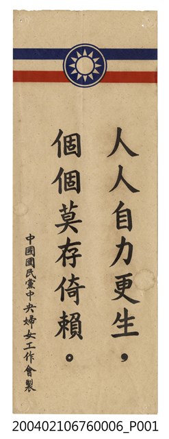 此為一紙質宣傳品,宣傳品上方有兩橫條並印有中國國民黨黨徽,為中國國民黨中央婦女工作會製,內容為〈人人自力更生,個個莫存倚賴。〉。 此件所提及的「婦工會」,為中國國民黨於1953年所創辦的婦女工作會,隸屬於國民黨中央委員會下的中央婦女工作指導會議。宋美齡在 1950年代開始整合臺灣婦女界的民間力量,先於1950年創設民間團體「中華民國婦女聯合會」,而後在中國國民黨內設立「中國國民黨中央婦女工作會」,以領導、動員婦女,並成為聚集臺灣婦女的最高機構。此外,婦工會也配合國民黨政策,協助進行反共抗俄的宣傳。 此為戒嚴時期「婦工會」配合中華民國政府反共政策所印製的宣傳品,1949年中華民國政府撤退來臺之後,與中共政權依然透過政治宣傳隔海交戰。中華民國政府對內藉由教育、口號及政治文宣來宣傳「反攻大陸」,穩固在臺澎金馬地區的統治;對外則以中共政權內部的動盪狀況,塑造臺灣社會「中華文化復興基地」的形象,爭取中國大陸民眾、各地海外華僑及國際社會的認同。