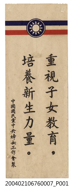 此為一紙質宣傳品,宣傳品上方有兩橫條並印有中國國民黨黨徽,為中國國民黨中央婦女工作會製,內容為〈重視子女教育,培養新生力量。〉。 此件所提及的「婦工會」,為中國國民黨於1953年所創辦的婦女工作會,隸屬於國民黨中央委員會下的中央婦女工作指導會議。宋美齡在 1950年代開始整合臺灣婦女界的民間力量,先於1950年創設民間團體「中華民國婦女聯合會」,而後在中國國民黨內設立「中國國民黨中央婦女工作會」,以領導、動員婦女,並成為聚集臺灣婦女的最高機構。此外,婦工會也配合國民黨政策,協助進行反共抗俄的宣傳。 此為戒嚴時期「婦工會」配合中華民國政府反共政策所印製的宣傳品,1949年中華民國政府撤退來臺之後,與中共政權依然透過政治宣傳隔海交戰。中華民國政府對內藉由教育、口號及政治文宣來宣傳「反攻大陸」,穩固在臺澎金馬地區的統治;對外則以中共政權內部的動盪狀況,塑造臺灣社會「中華文化復興基地」的形象,爭取中國大陸民眾、各地海外華僑及國際社會的認同。