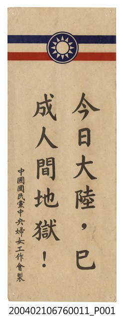 此為一紙質宣傳品,宣傳品上方有兩橫條並印有中國國民黨黨徽,為中國國民黨中央婦女工作會製,內容為〈今日大陸,已成人間地獄!〉。 此件所提及的「婦工會」,為中國國民黨於1953年所創辦的婦女工作會,隸屬於國民黨中央委員會下的中央婦女工作指導會議。宋美齡在 1950年代開始整合臺灣婦女界的民間力量,先於1950年創設民間團體「中華民國婦女聯合會」,而後在中國國民黨內設立「中國國民黨中央婦女工作會」,以領導、動員婦女,並成為聚集臺灣婦女的最高機構。此外,婦工會也配合國民黨政策,協助進行反共抗俄的宣傳。 此為戒嚴時期「婦工會」配合中華民國政府反共政策所印製的宣傳品,1949年中華民國政府撤退來臺之後,與中共政權依然透過政治宣傳隔海交戰。中華民國政府對內藉由教育、口號及政治文宣來宣傳「反攻大陸」,穩固在臺澎金馬地區的統治;對外則以中共政權內部的動盪狀況,塑造臺灣社會「中華文化復興基地」的形象,爭取中國大陸民眾、各地海外華僑及國際社會的認同。