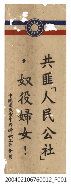此為一紙質宣傳品,宣傳品上方有兩橫條並印有中國國民黨黨徽,為中國國民黨中央婦女工作會製,內容為〈共匪「人民公社」,奴役婦女!〉。 此件所提及的「婦工會」,為中國國民黨於1953年所創辦的婦女工作會,隸屬於國民黨中央委員會下的中央婦女工作指導會議。宋美齡在 1950年代開始整合臺灣婦女界的民間力量,先於1950年創設民間團體「中華民國婦女聯合會」,而後在中國國民黨內設立「中國國民黨中央婦女工作會」,以領導、動員婦女,並成為聚集臺灣婦女的最高機構。此外,婦工會也配合國民黨政策,協助進行反共抗俄的宣傳。 此為戒嚴時期「婦工會」配合中華民國政府反共政策所印製的宣傳品,1949年中華民國政府撤退來臺之後,與中共政權依然透過政治宣傳隔海交戰。中華民國政府對內藉由教育、口號及政治文宣來宣傳「反攻大陸」,穩固在臺澎金馬地區的統治;對外則以中共政權內部的動盪狀況,塑造臺灣社會「中華文化復興基地」的形象,爭取中國大陸民眾、各地海外華僑及國際社會的認同。