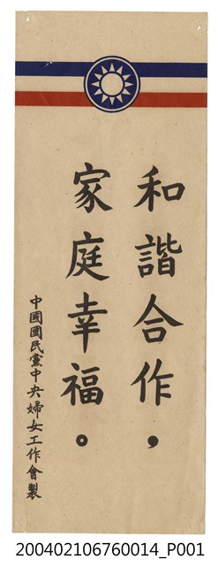 此為一紙質宣傳品,宣傳品上方有兩橫條並印有中國國民黨黨徽,為中國國民黨中央婦女工作會製,內容為〈和諧合作,家庭幸福。〉。 此件所提及的「婦工會」,為中國國民黨於1953年所創辦的婦女工作會,隸屬於國民黨中央委員會下的中央婦女工作指導會議。宋美齡在 1950年代開始整合臺灣婦女界的民間力量,先於1950年創設民間團體「中華民國婦女聯合會」,而後在中國國民黨內設立「中國國民黨中央婦女工作會」,以領導、動員婦女,並成為聚集臺灣婦女的最高機構。此外,婦工會也配合國民黨政策,協助進行反共抗俄的宣傳。 此為戒嚴時期「婦工會」配合中華民國政府反共政策所印製的宣傳品,1949年中華民國政府撤退來臺之後,與中共政權依然透過政治宣傳隔海交戰。中華民國政府對內藉由教育、口號及政治文宣來宣傳「反攻大陸」,穩固在臺澎金馬地區的統治;對外則以中共政權內部的動盪狀況,塑造臺灣社會「中華文化復興基地」的形象,爭取中國大陸民眾、各地海外華僑及國際社會的認同。