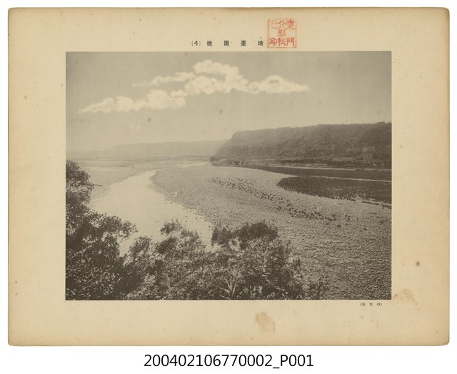 1. 本物件為以桃園臺地為主題的日治時期黑白照片,照片題名「(4)桃園臺地」,右下角有一小字樣「(新竹州)」,照片上有東門公學校之印。照片遠景右方為高臺地形,高臺斜切入溪,高臺旁邊有一溪流,從外觀看,此為平坦的溪流,且河床裸露,可能非為雨季。2. 臺地,為高而平坦的地形。現今桃園市的面積中,有一半屬於臺地地形,分屬桃園臺地、林口臺地與湖口臺地,其中以桃園臺地所佔的面積最大。桃園臺地因地勢較低,侵蝕少,地勢平坦,成為北部地區最重要的稻米產地。