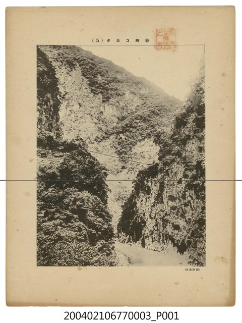 1. 本物件為以太魯閣峽谷為主題的日治時期黑白照片,照片題名「(5)タロコ峽谷」,右下角有一小字樣「(花蓮港廳)」,照片上有東門公學校之印。照片遠景為高聳的崖壁,中景有一條連結兩端崖壁的鐵線橋,遠觀望向的鐵線橋,又細又長,其兩端陡峭崖壁中間是一個峽谷,近景是鐵線橋底下的溪流。2. タロコ峽谷,為太魯閣峽谷,位於花蓮港廳北邊,狹谷流經的溪流是立霧溪。
