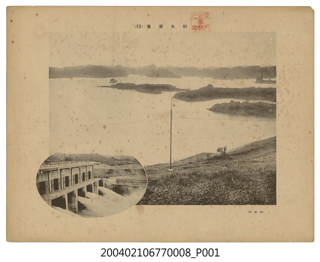 1. 本物件出自臺灣教育會出版,《臺灣教材寫真集》(1934)中之嘉南大圳相片,與館藏2004.020.0107.0019相同。2. 照片題名「(13)嘉南大圳」,右下角有一小字樣「(台南州)」,照片上有東門公學校之印,應屬學校之教材。大張照片遠景為綿延山脈,潭水與山脈相接,潭水的水量看似豐沛,潭水中央有尚未被淹沒的小丘,近景有一路燈立於旁邊。左下方小張照片近景貯水池的出水口正在送水中。3. 大張照片的拍攝地點為珊瑚潭,為現今的烏山頭水庫,因從空中鳥瞰宛如一株珊瑚,故名為珊瑚潭。3. 東門公學校,為西元1919年所創立的「嘉義市第二公學校」之前身,1932年校名改稱為「嘉義市東門公學校」。現今為嘉義市民族國民小學。(曾祥宇、曾明德撰寫)