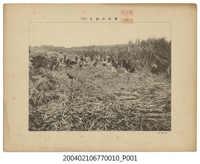 1. 本物件為以甘蔗的收穫為主題的日治時期黑白照片,照片題名「(15)甘蔗の收穫」,右下角有一小字樣「(高雄州)」,照片上有東門公學校之印。照片全景為甘蔗田景觀,遠景及中景有數十位工人,有男有女,穿著工作服,正在收割甘蔗,左方有載運著滿滿甘蔗的車子。2. 此甘蔗農場為臺灣製糖阿猴工場(即今屏東糖廠),甘蔗園的甘蔗採收後可經由軌道運送到工場裡進行作業。