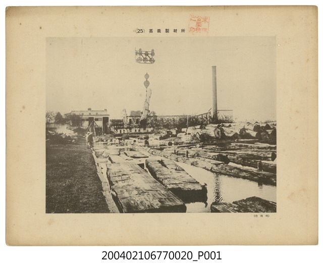 本物件為以嘉義製材為主題的日治時期黑白照片,照片題名「(25)嘉義製材所」,右下角有一小字樣「(台南州)」,照片上有東門公學校之印。照片前景為貯木池,貯木池中有許多木材,貯木池內的木材種內大多是扁柏與紅檜。中景為一大型機具吊起木頭的作業過程,遠景為貯木場的製材室,旁有一大煙囪。