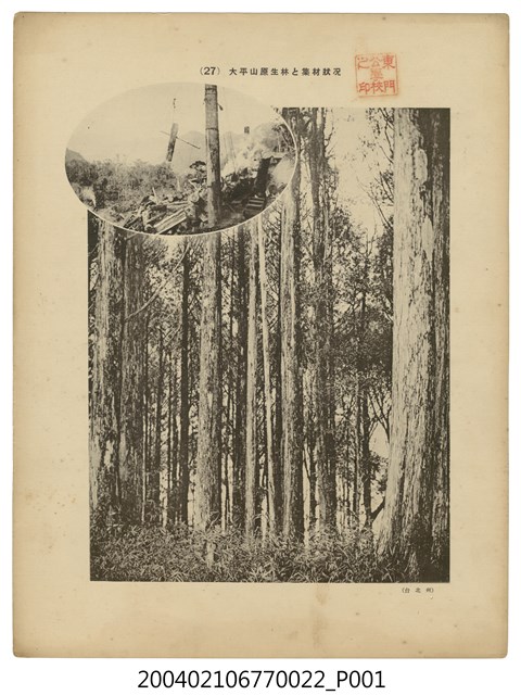 1. 本物件為以大平山原生林與集材狀況為主題的日治時期黑白照片,照片題名「(27)大平山原生林と集材狀況」,右下角有一小字樣「(台北州)」,照片上有東門公學校之印。大張照片為太平山原生林的樣貌,有扁柏、紅檜等原生林覆蓋,樹林生長密集。小張照片全景為太平山木材集材狀況,集材係指林木伐倒後,集中存放的作業過程,近景大型機具吊運木材的作業景況,該機器名稱為「架空式鐵索集材機」。2. 太平山國家森林遊樂區,位於臺灣東北部的宜蘭縣境內,行政區域分屬於大同鄉與南澳鄉,屬中央山脈的北端。