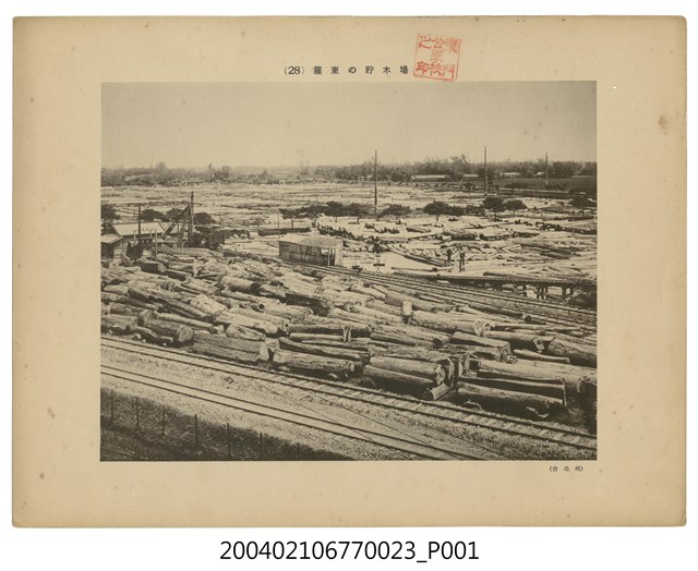 1. 本物件為以羅東的貯木場為主題的日治時期黑白照片,照片題名「(28)羅東の貯木場」,右下角有一小字樣「(台北州)」,照片上有東門公學校之印。全景為羅東的貯木場景況,遠景有貯木池,中景有自太平山搬運至此堆放的巨大木材,左方有搬運木材的機具設備,前景有兩道鐵軌,此鐵道連接羅東貯木場與太平山。2. 太平山林業, 西元1921年興建與收購糖廠鐵道為太平山森林運材鐵道,鐵道總長 36.95 公里,自此大興伐木為太平山林業。當時與阿里山、八仙山林場並列為日治時期三大林場,其開採規模為三大林場之首。