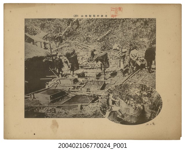 本物件為以山地製腦的狀況為主題的日治時期黑白照片,照片題名「(29)山地製腦の狀況」,右下角有一小字樣「(新竹州)」,照片上有東門公學校之印。大張照片為新竹州削取角板山中的一個樟腦寮,中景左方有一茅草搭建的樟腦寮,旁邊有警察,右有腦丁們背著竹籠,搬運樟樹皮至腦寮。下方張片中是一名腦丁用手釜削起樟樹,之後將會以蒸餾方式對樟樹樹皮汲取樟腦油。