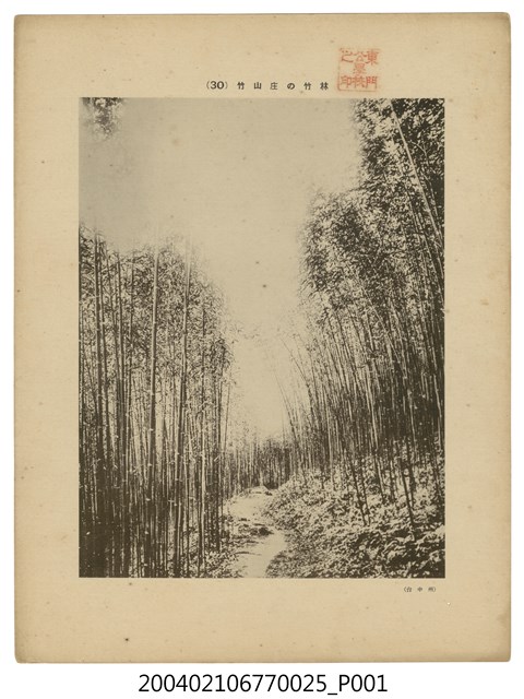 1. 本物件為以竹山庄的竹林為主題的日治時期黑白照片,照片題名「(30)竹山庄の竹林」,右下角有一小字樣「(台中州)」,照片上有東門公學校之印。照片全景為竹子叢生的竹林,竹林間有一條蜿蜒小徑,此為臺中州竹山郡竹山庄的桂竹林景觀。2. 日治時期記載,桂竹生長在本島的北部、中部山野之中;竹山有豐富的桂竹林,亦為桂竹的產出地。