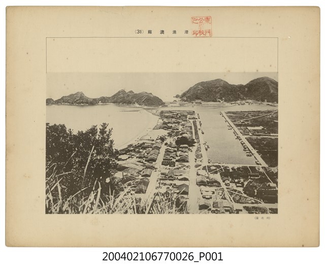 1. 本物件為以蘇澳漁港為主題的日治時期黑白照片,照片題名「(31)蘇澳漁港」,右下角有一小字樣「(台北州)」,照片上有東門公學校之印。照片全景為南方澳港口位置景觀,遠景周圍有崖壁,形成一個港灣,中景港口入口處有築有防波堤,近景有聚落聚集在港灣旁。2. 蘇澳港,舊稱「東港」,為北方澳、蘇澳、南方澳形成的天然港灣。日治時期在蘇澳地區闢建蘇澳港,於大正12年(1923)舉行開港式,並興建漁市場。